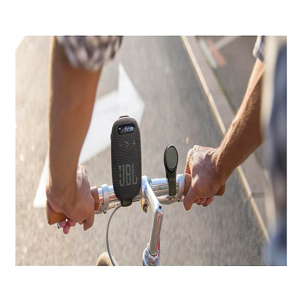 Listo para rodar El altavoz Bluetooth portátil JBL Wind 3 está hecho para montar en bicicleta. Se ajusta en un soporte de manubrio incluido que fijarás a tu bicicleta. Y si estás a pie, puedes quitar el altavoz del soporte y fijarlo a tu cinturón, ropa o mochila con el clip de cinturón integrado. El Wind 3 es totalmente impermeable, así que no te preocupes si estás atrapado en una ráfaga de nubes. Opciones de entretenimiento Puedes transmitir música de forma inalámbrica desde tu smartphone a través de Bluetooth. El Wind 3 también tiene un sintonizador FM integrado, por lo que puedes escuchar el gran juego mientras andas en bicicleta. También hay una ranura para tarjetas SD para tarjetas de hasta 64 GB. ¡Carga tu lista de reproducción de entrenamiento y comienza a pedalear! Botones táctiles elevados fáciles de usar en la parte delantera y los lados del altavoz te permiten hacer ajustes sin quitar la vista de la carretera. El altavoz también tiene una entrada auxiliar de minijack estéreo para conectar una fuente de audio con cable. La batería recargable integrada del Wind 3 te da hasta 5 horas de funcionamiento. Y la visualización LCD del altavoz te permite ver claramente lo que está reproduciendo.